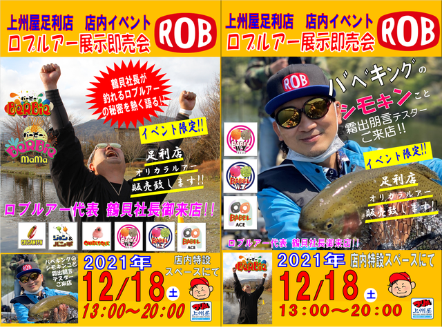 2021年12月18日(土)13:00~20:00(予定)、上州屋足利店にROBロブルアー代表鶴貝氏と、バベキングのシモキンこと霜出朋言(しもでとものり)テスターが来店!ROBロブルアー展示即売会を開催します!