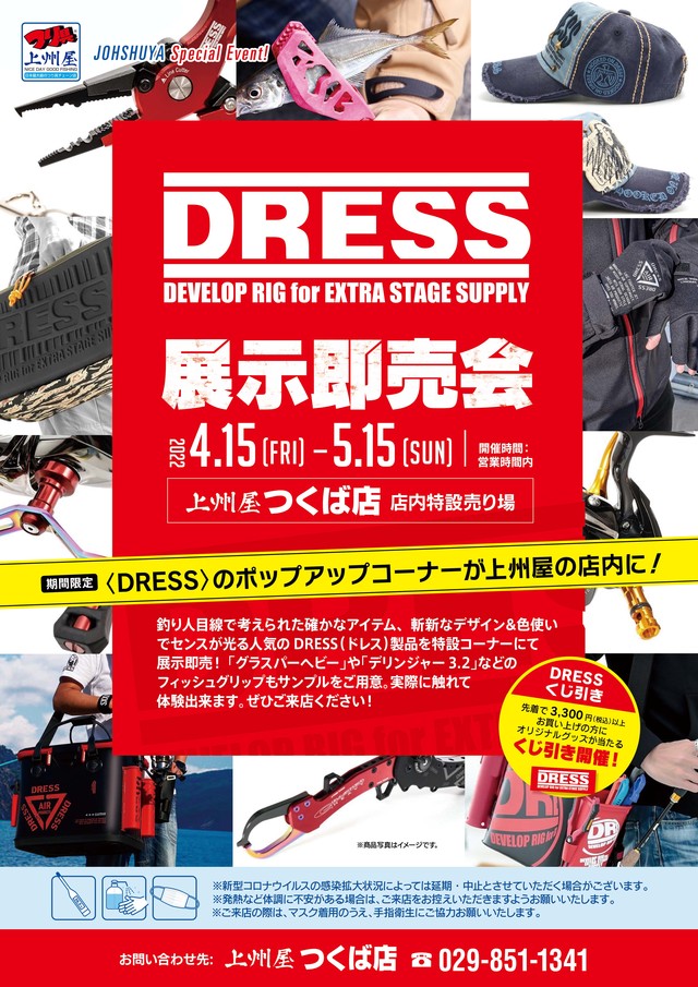 2022年4月15日(金)~5月15日(日)の間、上州屋つくば店にてDRESS|ドレス、フィッシングギアの展示即売会を開催します!
