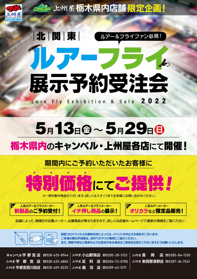 2022年5月13日(金)~5月29日(日)まで、栃木県内のキャンベル・上州屋各店にて「北関東ルアーフライ展示予約受注会2022」を開催します。