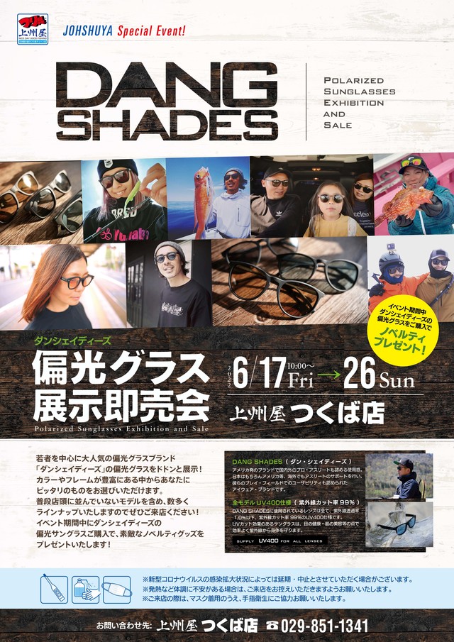 2022年6月17日(金)~26日(日)の10日間、上州屋つくば店にてDANG SHADES(ダン・シェイディーズ)偏光グラスの展示即売会を開催します!