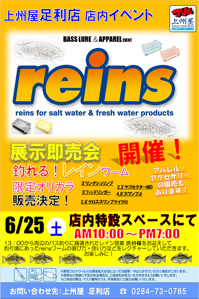 2022年6月25日(土)10:00~19:00、上州屋足利店にて人気ルアーメーカー、reins|レインのバスルアー&アパレル展示即売会を開催します!