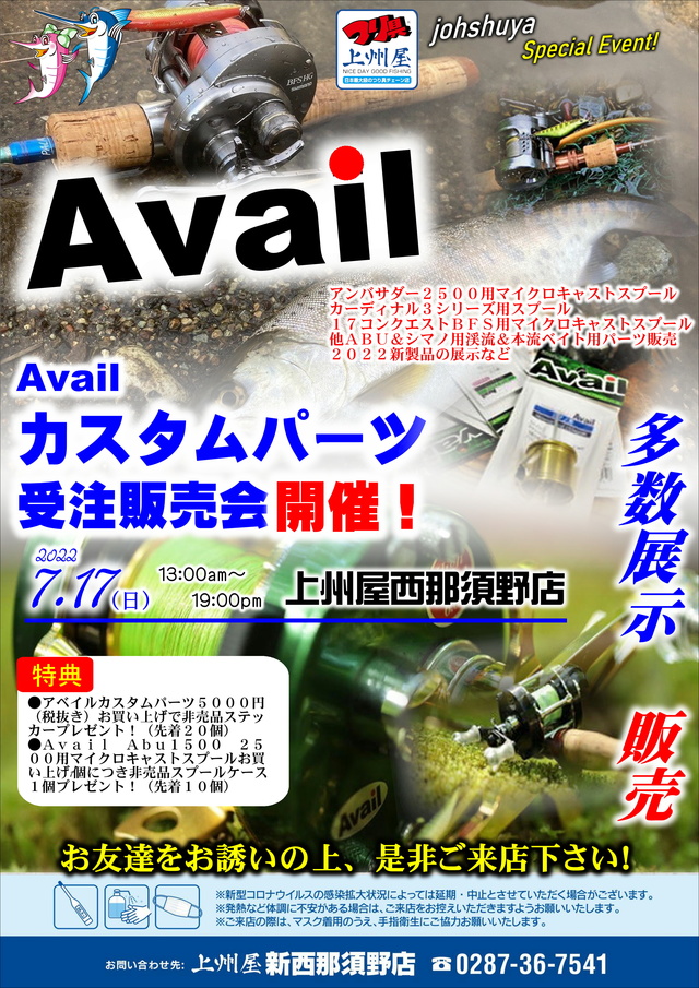 シマノの最新のリールや、アブのアンバサダー、カーディナル、五十鈴工業のBCシリーズなどのリールカスタムパーツ、チューニングアップパーツ、ドレスアップパーツetc.の老舗製造メーカーとして定評あるAvail(アベイル)の店頭イベント!