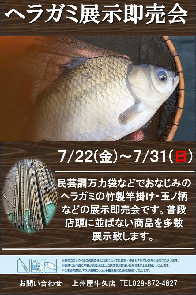 2022年7月22日(金)~31日(日)の10日間、上州屋牛久店にて民芸調万力袋などでお馴染み、ヘラガミの竹製竿掛け・玉ノ柄などの展示即売会を開催します!