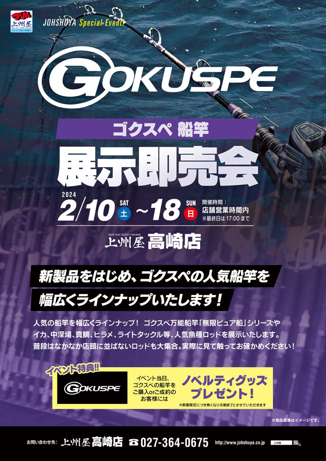 2024年2月10日(土)~18日(日)の9日間、上州屋高崎店にてゴクスペ“船竿”展示即売会を開催します!