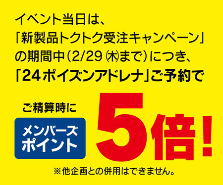 イベント期間中は「新製品トクトク受注キャンペーン」適用期間中につき、「24ポイズンアドレナ」ご予約でご精算時にメンバーズポイント5倍!