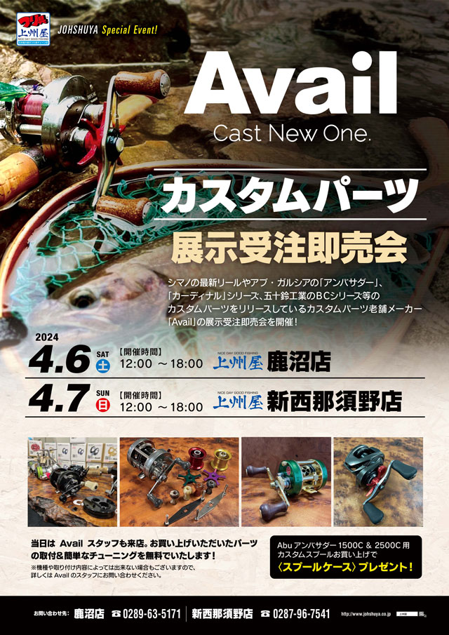 シマノの最新のリールや、アブのアンバサダー、カーディナル、五十鈴工業のBCシリーズなどのリールカスタムパーツ、チューニングアップパーツ、ドレスアップパーツetc.の老舗製造メーカーとして定評あるAvail(アベイル)の店頭イベント!