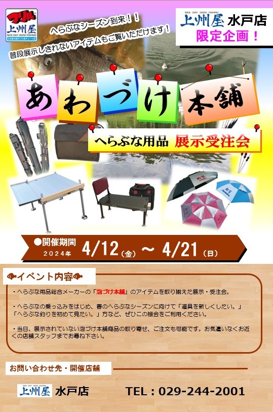 2024年4月12日(金)~21日(日)の10日間、上州屋水戸店にて泡づけ本舗“へら鮒用品”の展示受注会を開催します。