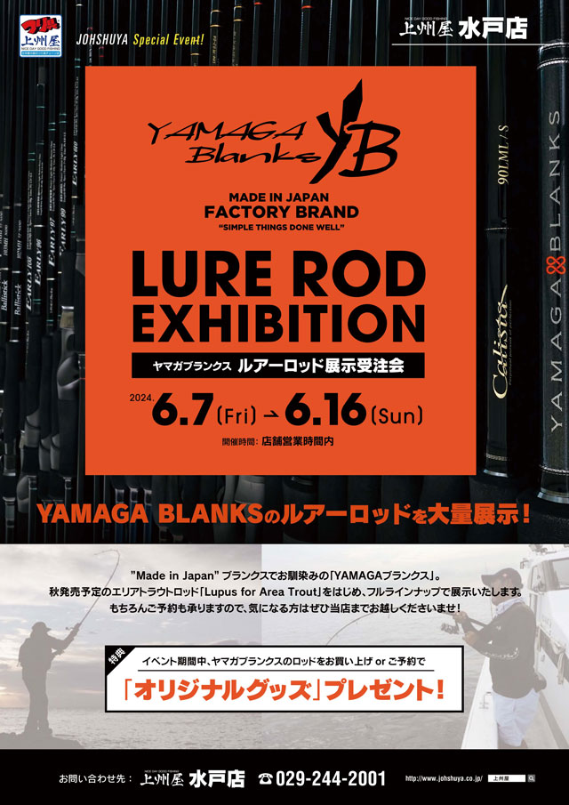 2024年6月7日(金)~6月16日(日)までの約10日間、上州屋水戸店にてヤマガブランクス社製、ルアーロッドの展示受注会を開催します!