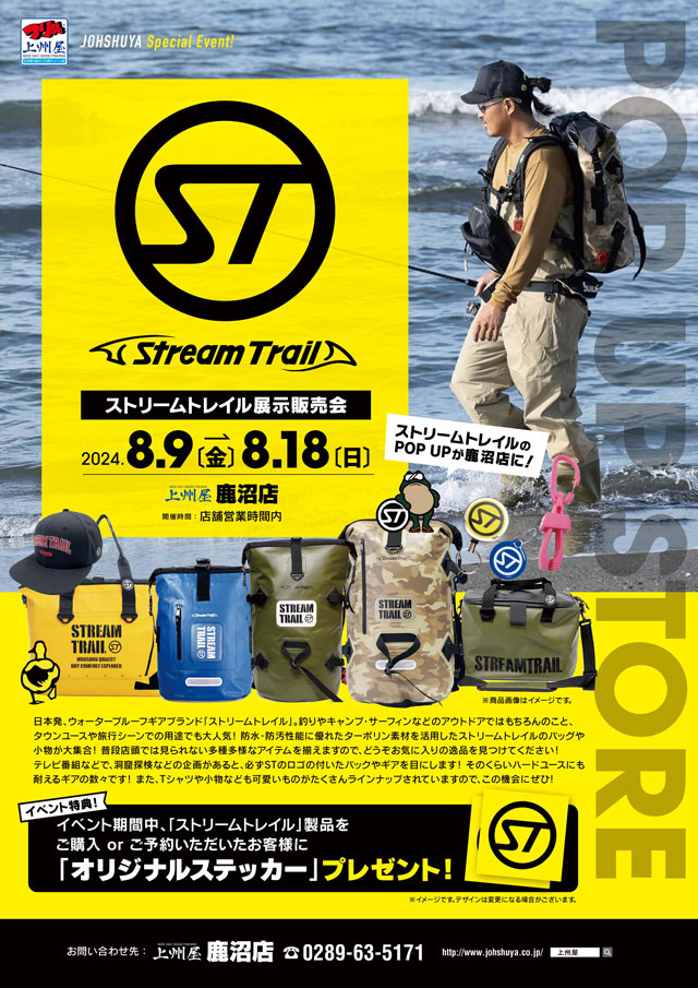 2024年8月9日(金)~18日(日)の10日間、上州屋鹿沼店にてストリームトレイル展示販売会を開催!店内に特設POPUPコーナーが登場します!