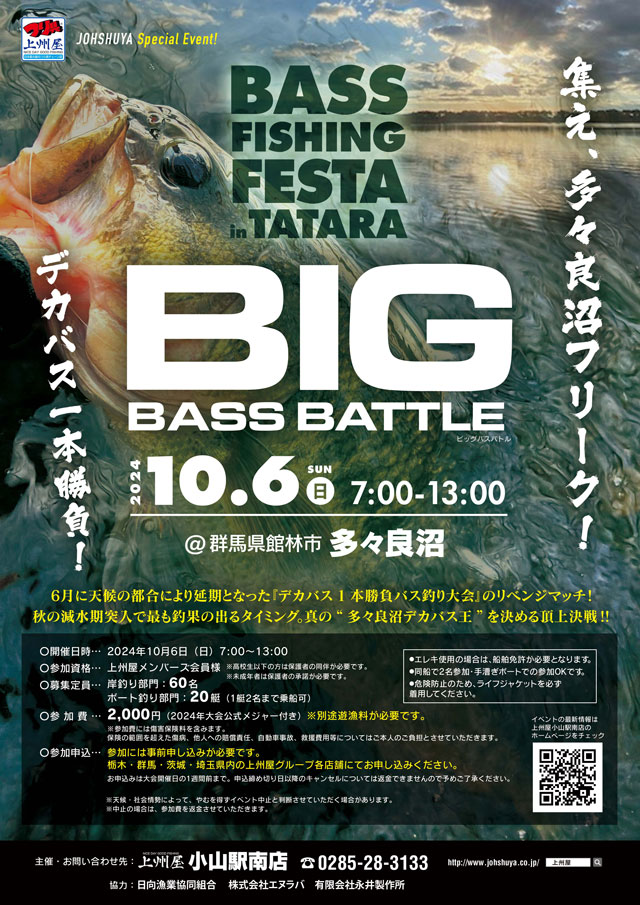 2024年10月6日(日)群馬県館林市、多々良沼にて多々良沼バス釣り大会『BIG BASS BATTLE』を開催します!オカッパリ&レンタルボートの2部門で1匹のサイズを競うでかバス1本勝負!