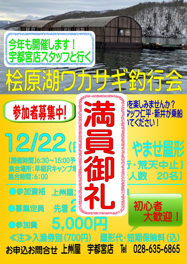 2024年12月22日(日)6:30~15:00予定、福島県桧原湖の「やませ屋形」にて「宇都宮店スタッフと行く、ワカサギ釣行会」を開催します!