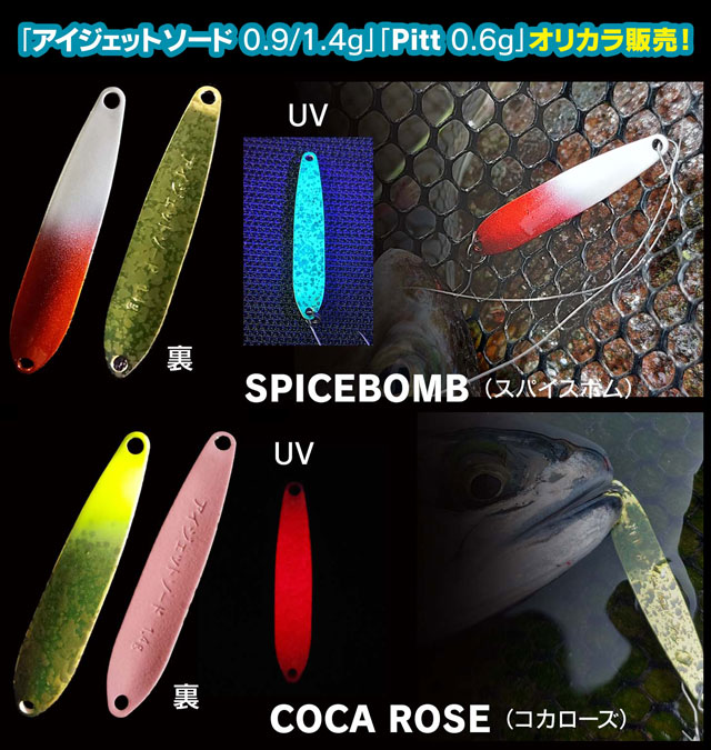 また、アイジェットリンクと言えば「アイジェットソード」&「Pitt」!上州屋高崎店オリカラでアピール系となる“スパイスボム”と“コカローズ”を「アイジェットソード0.9g、1.4g」「Pitt0.6g」で限定販売します!