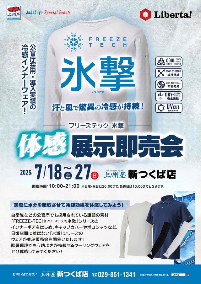 2025年7月18日(金)~27日(日)の10日間、上州屋新つくば店にて水分を吸収し生地自体の温度を下げる話題の冷感素材「FREEZE TECH(フリーズテック)氷撃」を採用したインナーギアの展示即売会を開催します!