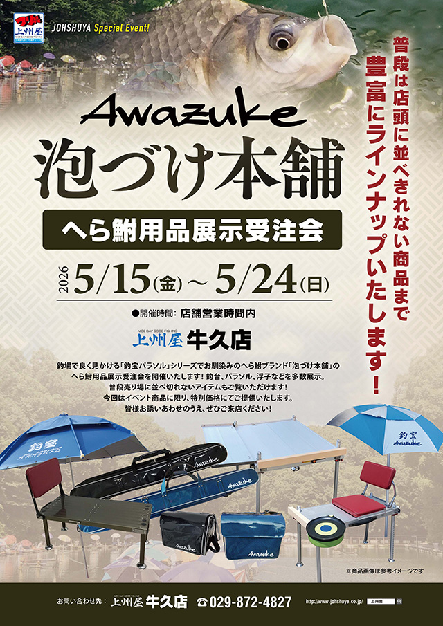 2026年5月15日(金)~24日(日)の10日間、上州屋牛久店にて泡づけ本舗“へら鮒用品”の展示受注会を開催します。