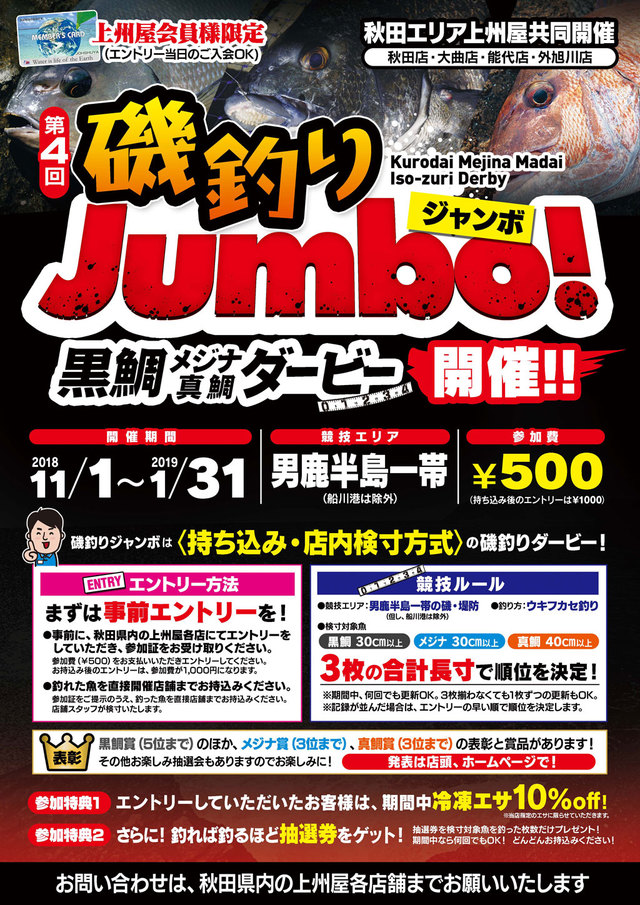 2018年11月1日(木)~2019年1月31日(木)の間、秋田県内上州屋各店にて「第4回磯釣りジャンボ!黒鯛・メジナ・真鯛ダービー」を開催します!