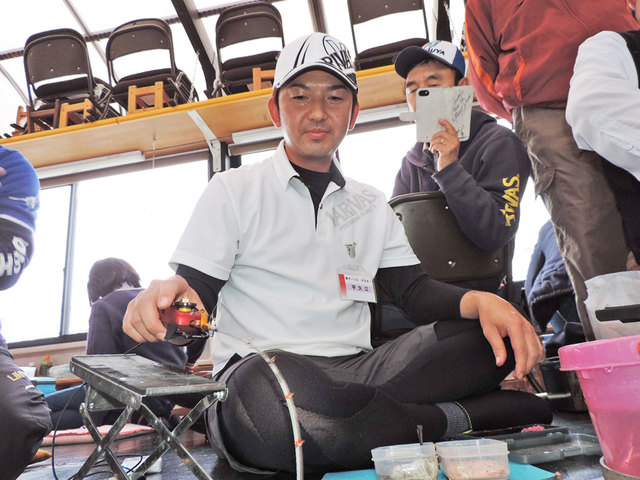 今年はワカサギ釣り名人!VARIVASインストラクター平久江洋和氏が駆けつけてくれました!参加者の皆さんにドーム船ワカサギ釣りの秘訣、釣れる仕掛け、テクニックetcを伝授!