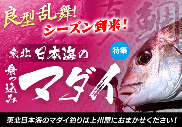 最盛期の良い日に当たると3kg、5kgオーバーの良型も含めて、1人10枚!20枚!といった驚異の釣果も飛び出す爆発力が東北・日本海方面マダイフィールド最大の特長!マダイの荒食いに遭遇するチャンス!3月、4月、5月の乗っ込みシーズンには、遠く太平洋側からも東北・日本海方面へ遠征する釣り人が後を断ちません。