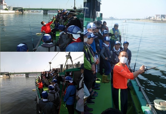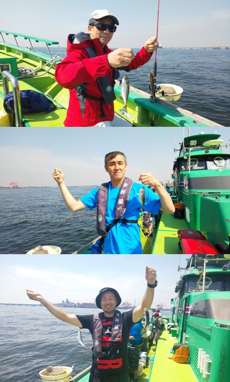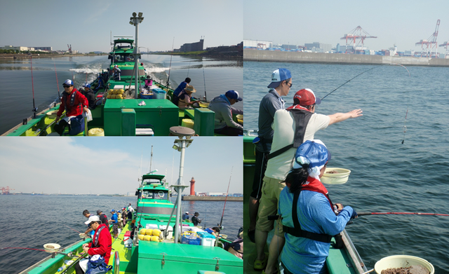 旧江戸川を下って目指すポイントは川崎~横浜沖。1時間も掛からず到着して早速スタッフによるレクチャー開始と思いきや、1投目からダブルヒットが出る高活性!船内各所で歓声が上がり始めました!