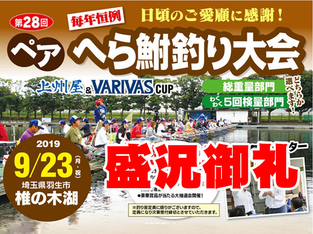 2019年9月23日(祝)今年で第28回目!恒例のペアへら鮒釣り大会 上州屋&VARIVAScupが埼玉県椎の木湖にて開催されました。当日は大会中盤からの強風に悩まされはしましたが、多くのへら鮒ファンの皆様に熱いバトルを繰り広げていただきました!