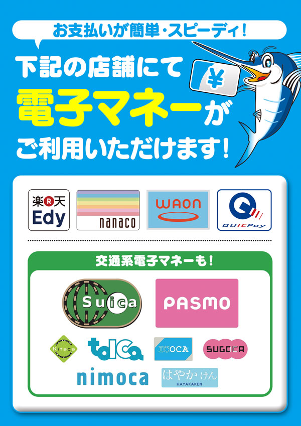 〔交通系〕Suica(JR東日本)、PASMO(株式会社パスモ)、Kitaca(JR北海道)、TOICA(JR東海)、ICOCA(JR西日本)、SUGOCA(JR九州)、nimoca(株式会社ニモカ)、はやかけん(福岡市交通局)