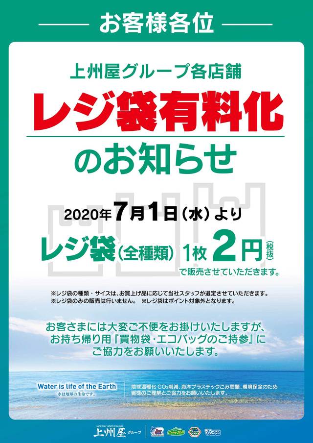 2020年7月1日(水)より上州屋グループ全店にてレジ袋を有料化し、全種類1枚2円(税抜)での販売とさせていただきます。お客様には大変ご不便をお掛けいたしますが、お持ち帰り用「買物袋・エコバックのご持参」にご協力をお願い致します。