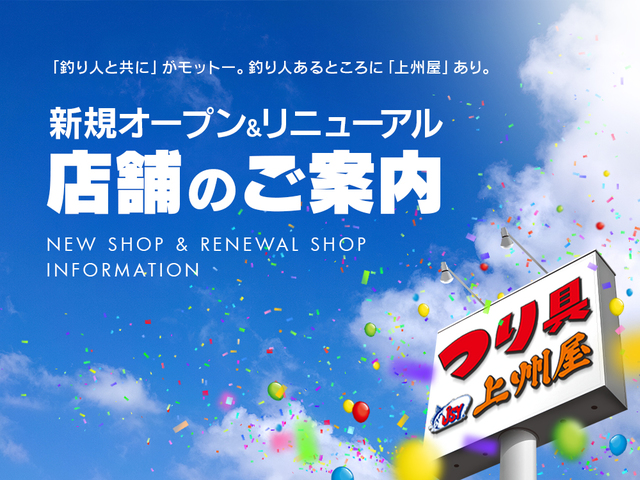上州屋グループにて、新規オープンまたは改装リニューアルにより、扱い商品や店内品揃えetc.が大きく生まれ変わった店舗を紹介します!以前にまして地域密着・情報満載・買い物しやすい店舗で皆様のフィッシングライフをスタッフ一同サポートしてまいります。釣行の準備だけでなく、帰り道やお近くにお越しの際にはぜひお立ち寄りください。
