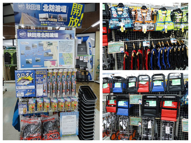 秋田港北防波堤の地元、上州屋秋田外旭川店および秋田店はもちろん、大曲店能代店など、釣り場開放シーズン中は県内各店で特設コーナーを展開します。
