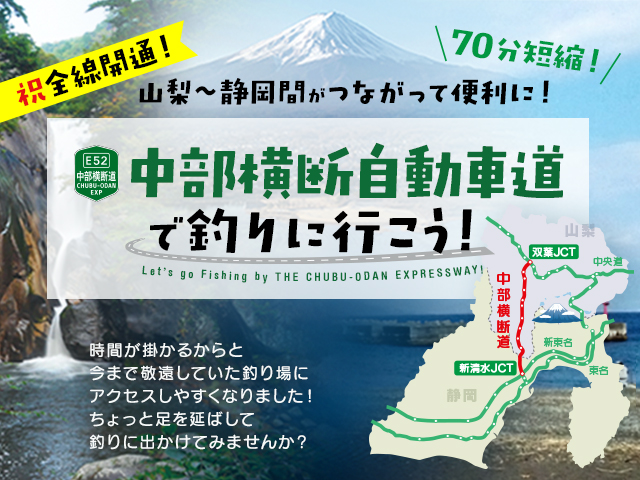 今まで時間が掛かった長野⇔山梨⇔静岡の各釣り場へのアクセスが一層速くなります!従来国道52号線を使用した場合に比べて約70分の時間短縮!
