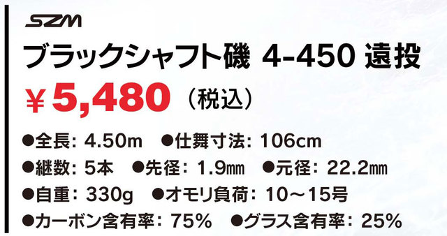 SZM遠投磯竿「ブラックシャフト磯4-450/4-530」好評販売中!