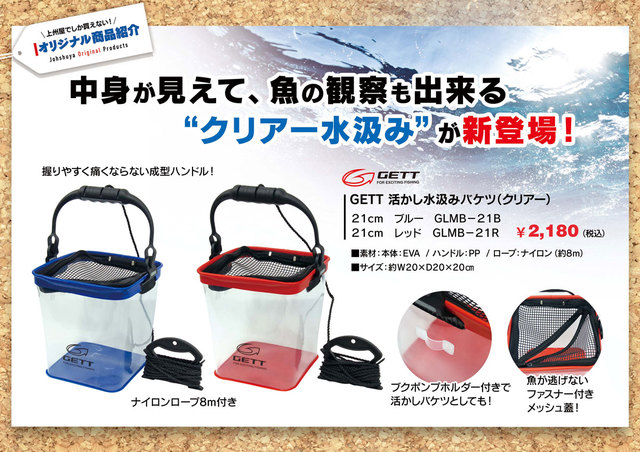 GETT(ゲット)より、中身が見えて魚の観察もできる“クリアー水汲み”が新登場!「21cmブルー(GLMB-21B)」および「21cmレッド(GLMB-21R)」を上州屋グループ各店にて好評販売中です!