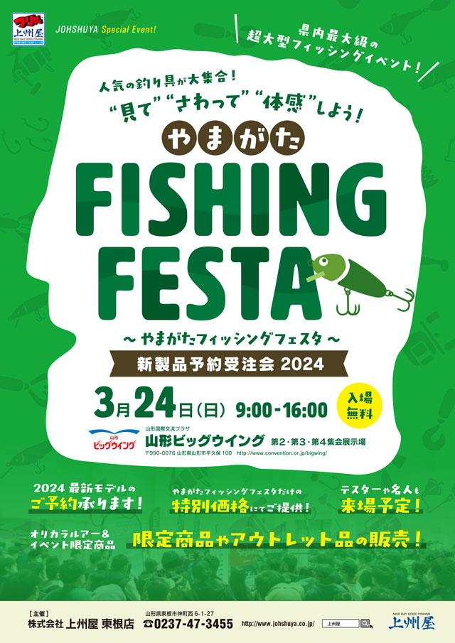 さらに同じ山形県内にて2024年3月24日(、山形県山形市の“山形ビッグウイング”にてやまがたフィッシングフェスタ2024新製品予約受注会開催予定!こちらもどうぞお楽しみに!