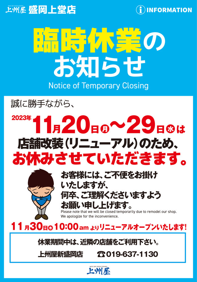 臨時休業中は何かとご不便をおかけいたしますが、盛岡上堂店の休業期間中は近隣「上州屋新盛岡店」のご利用をお願い申し上げます。