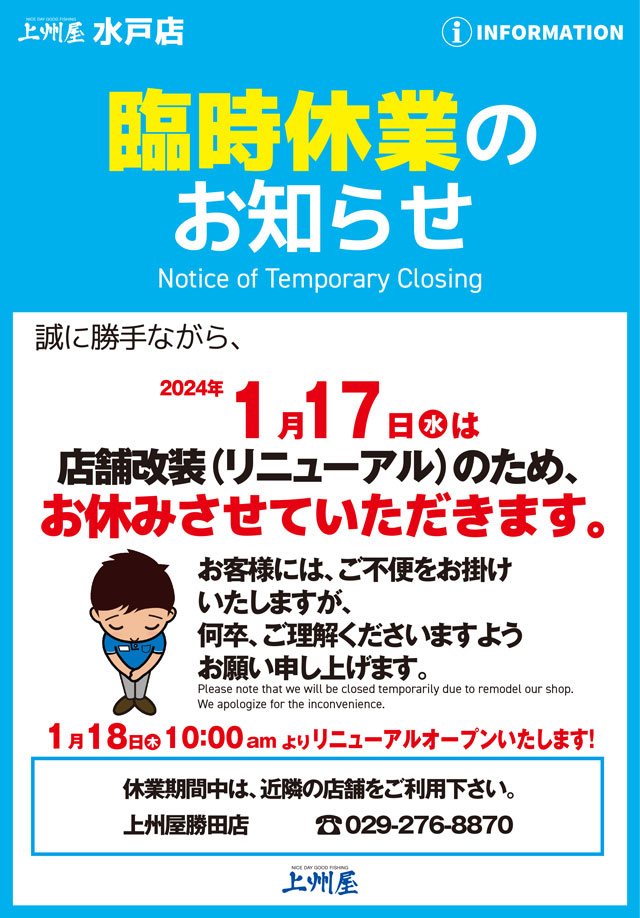 臨時休業の際は何かとご不便をおかけいたしますが、水戸店の休業期間中は近隣上州屋勝田店などのご利用をお願い申し上げます。