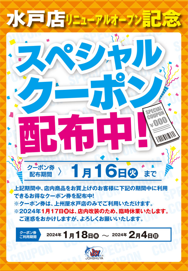 只今、上州屋水戸店にて店内商品お買い上げのお客様に同店リニューアルオープン後(2024年1月18日~2月4日)にご利用いただけるスペシャルクーポン配布中!