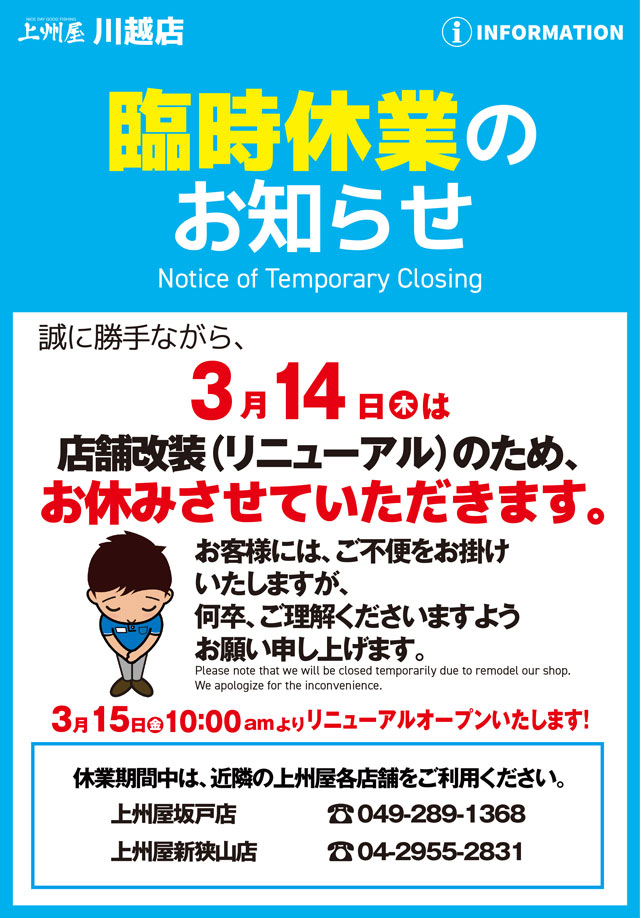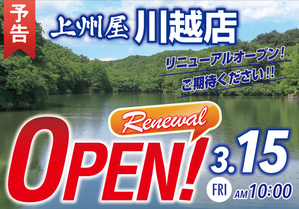 上州屋川越店、店舗改装による3/14(木)臨時休業および3/15(金)リニューアルオープンのお知らせ。