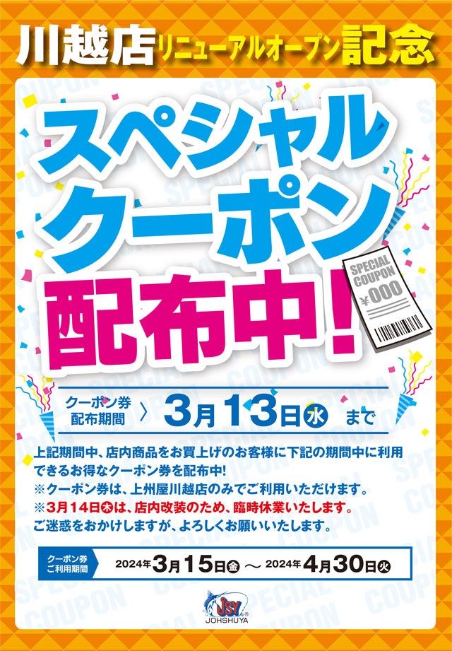 只今、上州屋川越店にて店内商品お買い上げのお客様に同店リニューアルオープン後(3月15日~4月30日)にご利用いただけるスペシャルクーポン配布中!