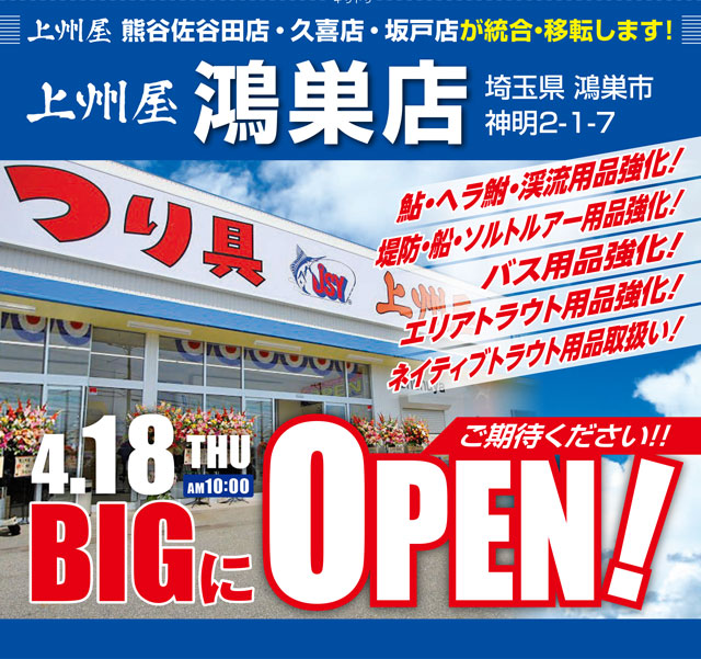 また、4月18日(木)上州屋鴻巣店オープンの際には盛大にオープンセールを開催しますので、どうぞご期待ください!