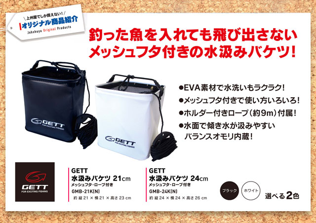 GETTゲットより、釣った魚を入れても飛び出さないメッシュフタ付き「水汲みバケツ21cm/24cm」発売!