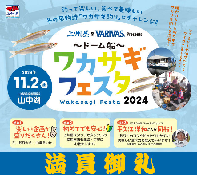 2024年11月2日(土)、山梨県山中湖、湖明荘マリーナドーム船にて、ワカサギ釣りイベント第11回上州屋&VARIVAS山中湖ドーム船ワカサギフェスタ2024を開催しました!