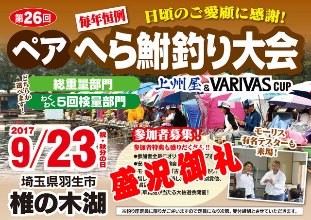 2017年9月23日()恒例のペアへら鮒釣り大会 上州屋&VARIVAScupが埼玉県椎の木湖にて開催されました。当日は前日からの雨を大会中盤まで引きずるあいにくの天候となってしまいましたが、多くのへら鮒ファンの皆様にお集まり頂き、雨に負けない熱いバトルを繰り広げていただきました!