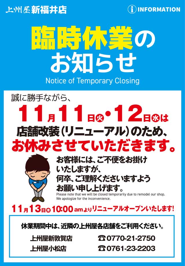 上州屋新福井店、店舗改装による11/11(火)~12(水)臨時休業および11/13(木)リニューアルオープンのお知らせ。