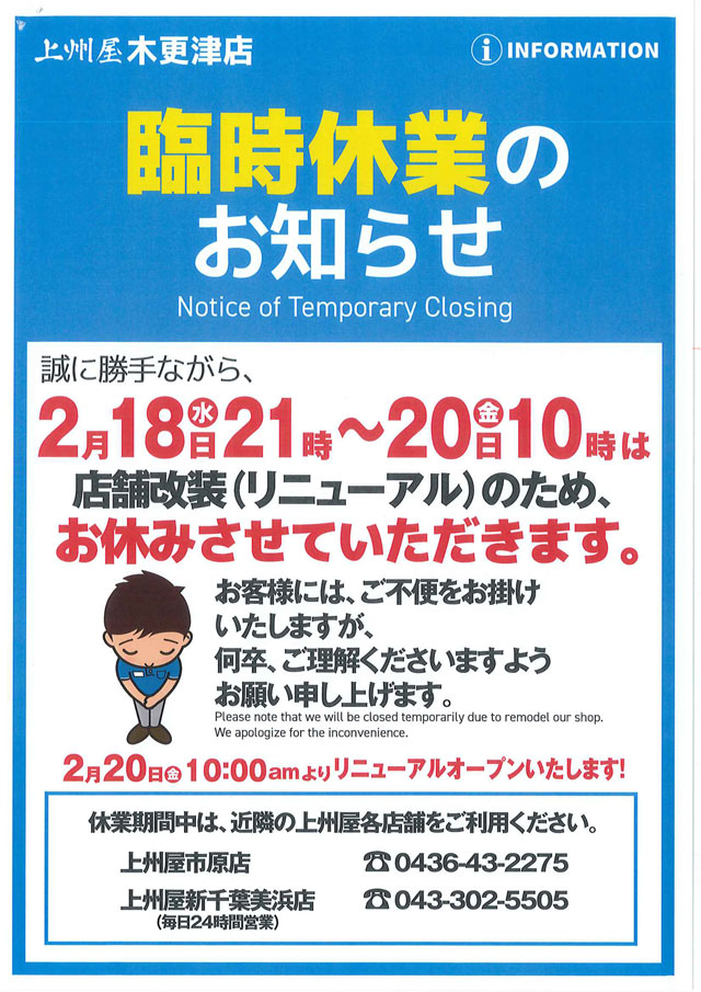 上州屋木更津店、店舗改装による2/18(水)21時~臨時休業および2/20(金)10時リニューアルオープンのお知らせ。