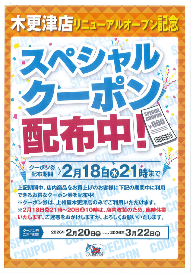 只今、上州屋木更津店では店内商品お買い上げのお客様に同店リニューアルオープン後(2月20日~3月22日)にご利用いただけるスペシャルクーポン配布中!