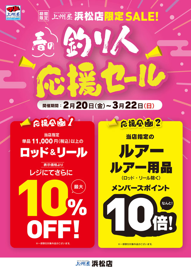 2026年2月20日(金)~3月22日(日)の期間中、上州屋浜松店にて店舗限定、春の釣り人応援セールを開催します!