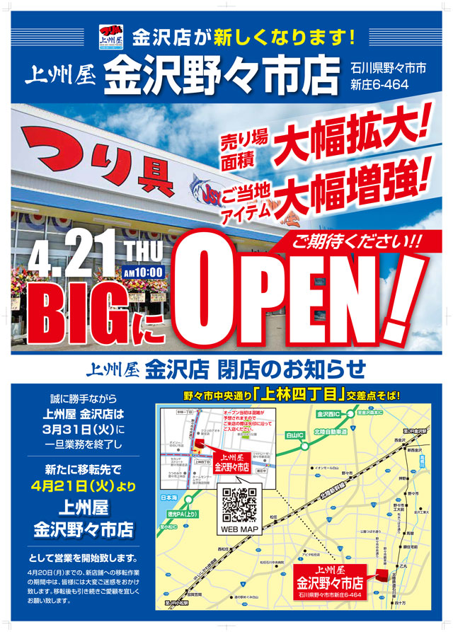 新たにオープンする上州屋金沢野々市店は、現店舗より売り場面積大幅拡大!ご当地アイテム大幅増強!さらに地域密着&充実の品揃えで皆様の釣りを応援します!