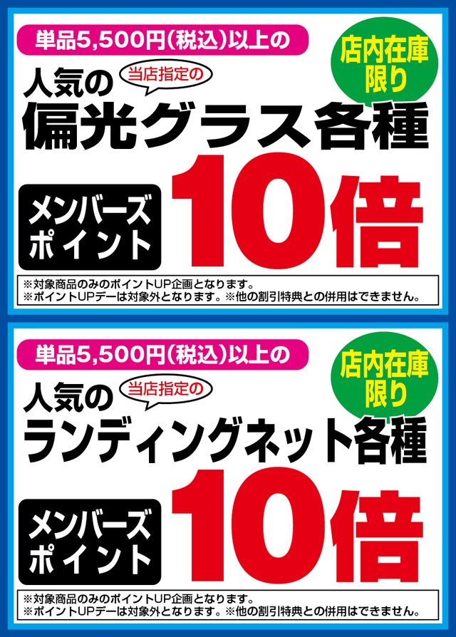 当店指定の人気の単品5,500円(税込)以上の偏光グラス各種、ランディングネット各種をお買い上げでメンバーズポイント10倍