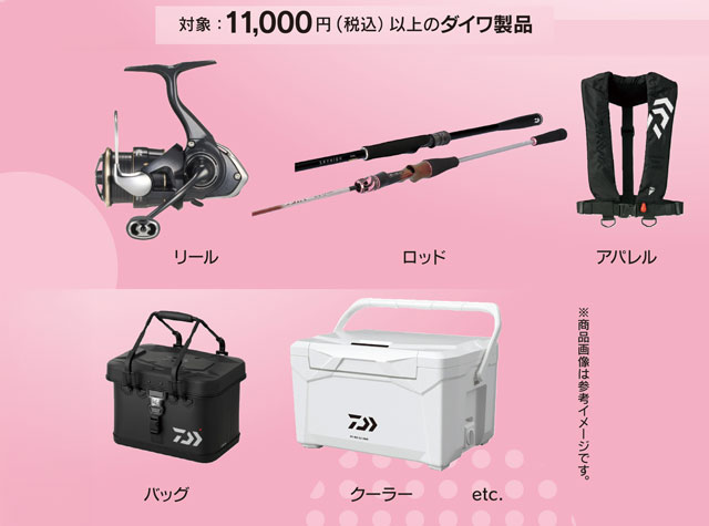 キャンペーン期間中、上州屋グループ各店にて単品11,000円(税込)以上のダイワ対象製品(リール、ロッド、アパレル、バッグ、クーラーetc.)をお買い上げの方に、抽選で5,500円(税込)分の「ダイワ製品限定商品券」をプレゼント