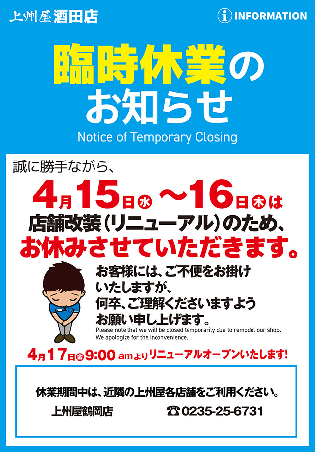 上州屋酒田店、店舗改装による4/15(水)~16(木)臨時休業および4/17(金)リニューアルオープンのお知らせ。