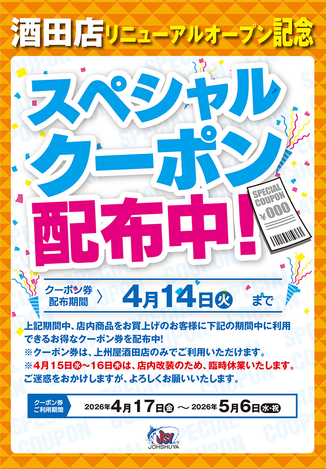 只今、上州屋酒田店では店内商品お買い上げのお客様に同店リニューアルオープン後(4月17日~5月6日)にご利用いただけるスペシャルクーポン配布中